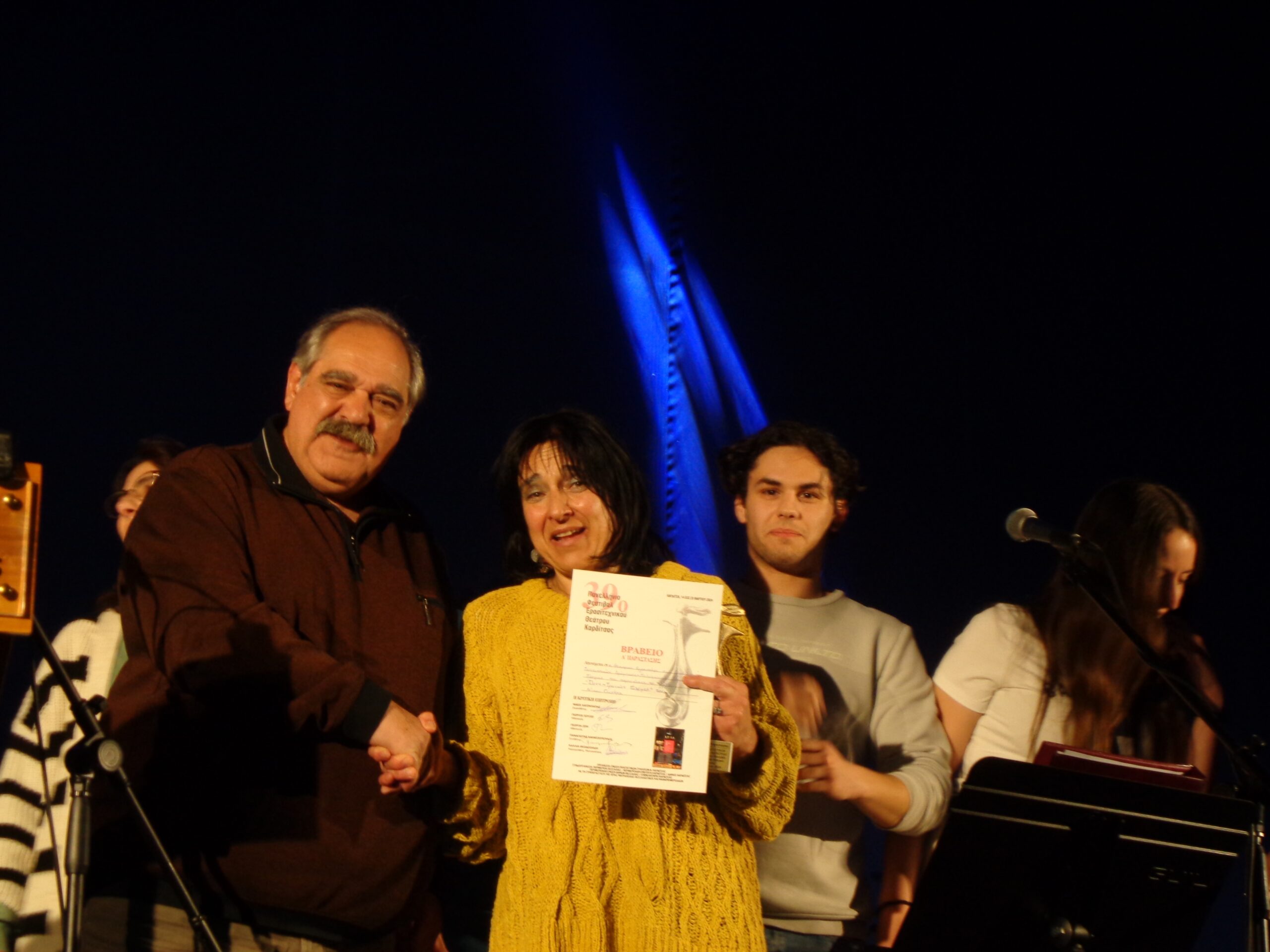 1) Στο Studio ΈΡΓΟΝ Θεσσαλονίκης που παρουσίασε το έργο «ΝONA» του ΡομπέρτοΚόσσα για την αξιέπαινη προσπάθεια απόδοσης ενός ιδιαίτερου έργου