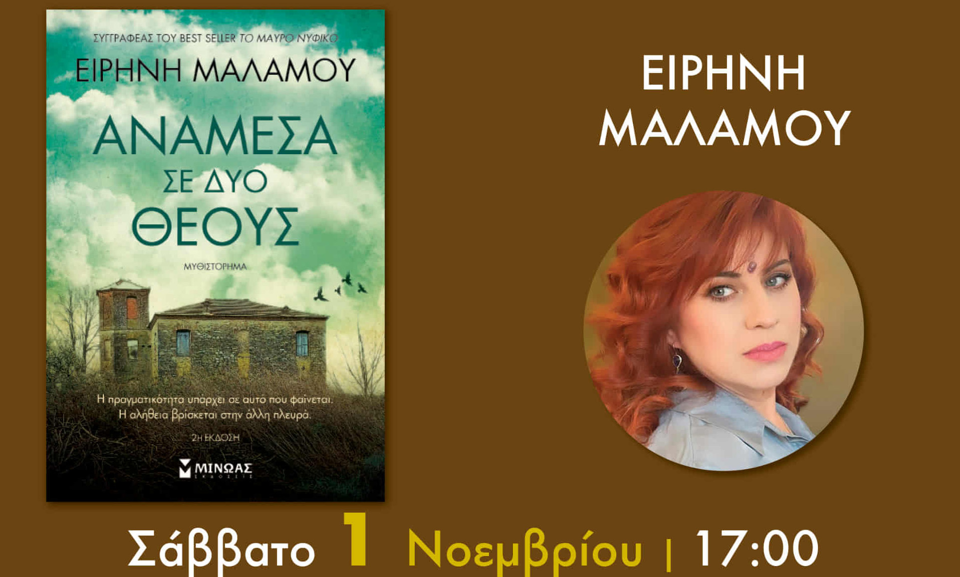 Η Λέσχη Ανάγνωσης Βιβλίου «Σοφά… δες!» και το Βιβλιοχαρτοπωλείο Ζάχος προσκαλούν το κοινό στην παρουσίαση του μυθιστορήματος της Ειρήνης Μαλάμου με τίτλο «Ανάμεσα σε Δύο Θεούς», το Σάββατο 1 Νοεμβρίου, στις 17:00, στο καφέ Οδός Ονείρων (Βάλβη 57, Καρδίτσα).