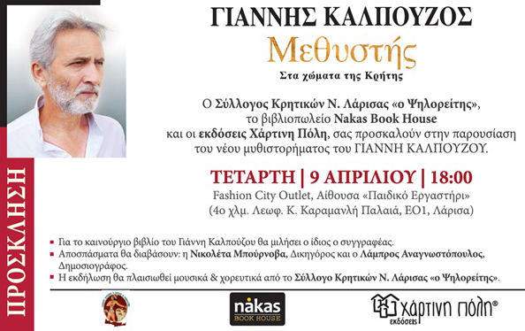 Το βιβλιοπωλείο NAKAS BOOK HOUSE, Ο Σύλλογος Κρητικών  Ν. Λάρισας «ο  Ψηλορείτης» και οι εκδόσεις Χάρτινη Πόλη σας προσκαλούν στην παρουσίαση του νέου μυθιστορήματος του Γιάννη Καλπούζου «Μεθυστής-Στα χώματα της Κρήτης»
