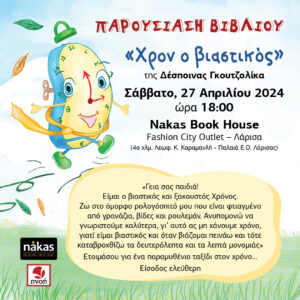 Σάββατο 27/4 18.00-19.30: Παρουσίαση Παιδικού βιβλίου από το βιβλιοπωλείο NAKAS BOOK HOUSE. To παιδικό εργαστήρι του Fashion City Outlet φιλοξενεί την παρουσίαση του βιβλίου «Χρον ο βιαστικός» της Δέσποινας Γκουτζολίκα. η συγγραφέας του βιβλίου και το βιβλιοπωλείο NAKAS BOOK HOUSE, έχουν ετοιμάσει για όλα τα παιδιά ένα παραμυθένιο ταξίδι στο χρόνο….