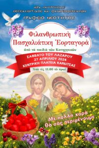 Η Ιερά Μητρόπολη Θεσσαλιώτιδος και Φαναριοφερσάλων ανακοινώνει ότι το Σάββατο 27 Απριλίου 2024 και ώρα 11:00΄π.μ., θα πραγματοποιηθεί Πασχαλινή εορτοαγορά του Γραφείου Νεότητος στην Κεντρική Πλατεία της πόλεώς μας.