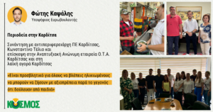 Ο υπ. Ευρωβουλευτής με το ΚΟΣΜΟΣ και μέλος του Πολιτικού Συμβουλίου του Βολτ Ελλάδας, Φώτης Καψάλης, πραγματοποίησε περιοδεία στην Καρδίτσα όπου και συναντήθηκε με τον αντιπεριφερειάρχη ΠΕ Καρδίτσας, Κωνσταντίνο Τέλιο. Η συζήτηση επικεντρώθηκε στις δυσκολίες που αντιμετωπίζει ο θεσμός της τοπικής αυτοδιοίκησης και η περιφέρεια να ανταποκριθούν στις ανάγκες των κατοίκων, λόγω του συγκεντρωτισμού που υπάρχει στην οργάνωση του ελληνικού κράτους ιδίως σε ότι αφορά τη ροή των αναγκαίων χρηματοδοτήσεων. Ο αντιπεριφερειάρχης ενημέρωσε τον Φώτη Καψάλη ότι η αποκατάσταση των ζημιών από το Danielστην ΠΕ Καρδίτσας όπως και οι προληπτικές παρεμβάσεις προστασίας προχωράει με το 70% των αναγκαίων αναχωμάτων να έχουν ήδη ολοκληρωθεί. Από εκεί και πέρα είναι ανάγκη να εφαρμοστεί ένας κατάλληλςο σχεδιασμός σε περιοχε΄ς γύρω από ποτάμια που έχουν επιχωματωθεί και να κατασκευαστούν νέα φράγματα σε ημιορεινές περιοχές προκειμένου να είναι δυνατή η συγκράτηση μεγάλων όγκων νερού. Τέλος και στην περιοχή της Καρδίτσας εξελίσσεται σε μγάλο πρόβλημα το φαινόμενο braindrainκαθώς όλο και περισσότεροι νέοι με υψηλό μορφωτικό επίπεδο και δυνατότητες επιλέγουν να αναζητήσουν σε άλλες περιοχές εντός και εκτός της χώρας επαγγελματική αποκτάσταση.