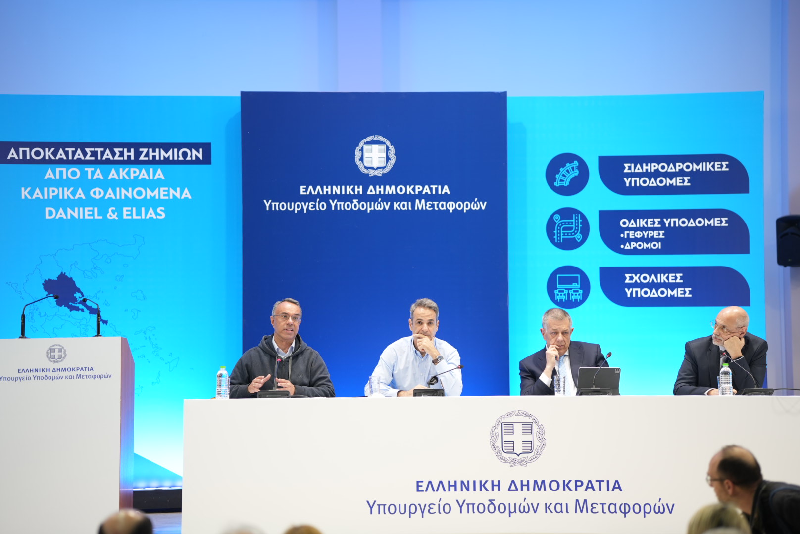 Το σχέδιο αποκατάστασης ζημιών από τα ακραία καιρικά φαινόμενα «Daniel» και  «Elias», σε Σχολικές, Σιδηροδρομικές και Οδικές Υποδομές στη Θεσσαλία και τη Στερεά Ελλάδα, παρουσίασαν σήμερα στο Μουζάκι Καρδίτσας, ο Υπουργός Υποδομών και Μεταφορών Χρήστος Σταϊκούρας, ο Υφυπουργός Υποδομών και Μεταφορών, αρμόδιος για τις Υποδομές Νίκος Ταχιάος και ο Γενικός Γραμματέας Υποδομών Κωνσταντίνος Μαγουλάς, παρουσία του Πρωθυπουργού Κυριάκου Μητσοτάκη.