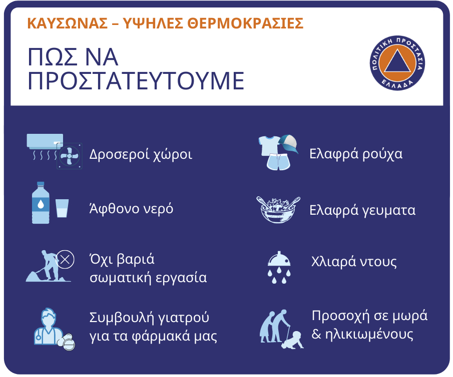 Οδηγίες για τον καύσωνα μπορείτε να βρείτε στον επίσημο ιστότοπο του Υπουργείου Κλιματικής Κρίσης & Πολιτικής Προστασίας: https://civilprotection.gov.gr/odigies-prostasias/kaysonas