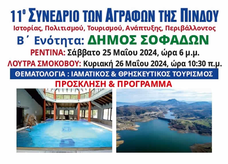 Στην Ιστορική Ρεντίνα, «Την βασίλισσα των Αγράφων» και στα Λουτρά Σμοκόβου του Δήμου Σοφάδων, συνεχίζονται το Σαββατοκύριακο 25 και 26 Μαϊου, οι εργασίες του 11ου  Συνεδρίου των Αγράφων της Πίνδου με θεματολογία τον ΙΑΜΑΤΙΚΟ και ΘΡΗΣΚΕΥΤΙΚΟ ΤΟΥΡΙΣΜΟ.