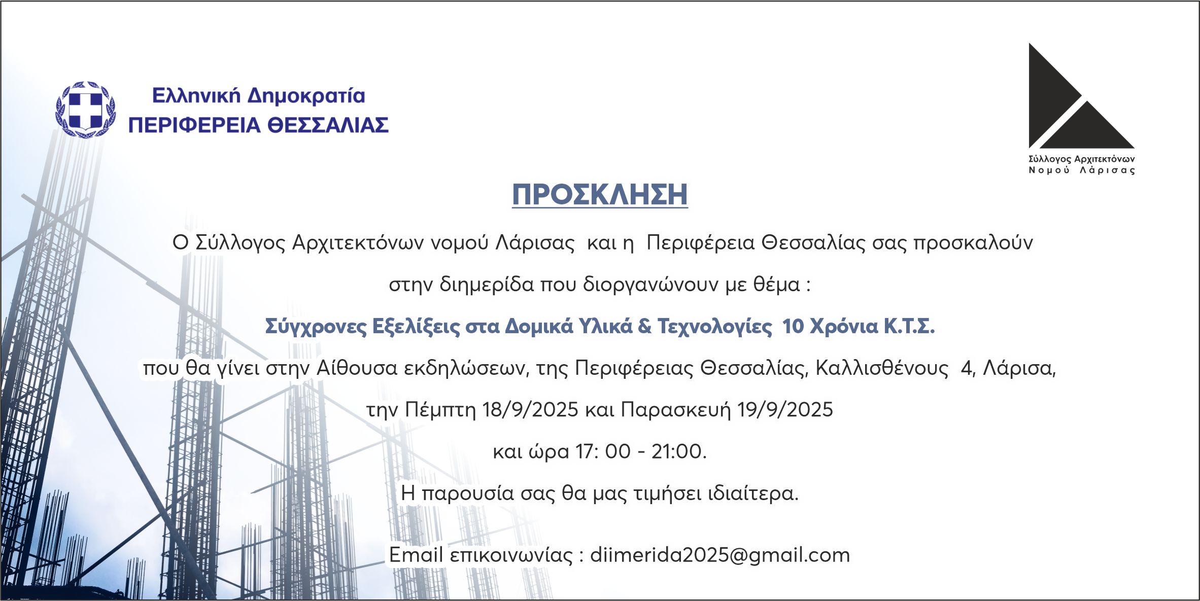 Ο Σύλλογος Αρχιτεκτόνων Λάρισας και η Περιφέρεια Θεσσαλίας διοργανώνουν στη Λάρισα εκδήλωση με θέμα : “Σύγχρονες Εξελίξεις στα Δομικά Υλικά -Νέες Τεχνολογίες – Νέος Κ.Τ.Σ.” Η εκδήλωση θα πραγματοποιηθεί στις 18 και 19 Σεπτεμβρίου 2025, από τις 17:00 έως τις 21:00, στην Αίθουσα Εκδηλώσεων της Περιφέρειας Θεσσαλίας (Καλλισθένους 4, Λάρισα).