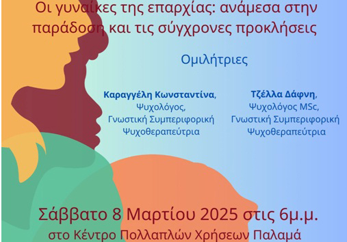 Ο Σύλλογος Γυναικών Παλαμά τιμώντας την Παγκόσμια Ημέρα της Γυναίκας διοργανώνει το Σάββατο 8 Μαρτίου στις 18:00 στο Κέντρο Πολλαπλών Χρήσεων του Δήμου Παλαμά εκδήλωση με θέμα 《Οι γυναίκες της επαρχίας: ανάμεσα στην παράδοση και στην σύγχρονες προκλήσεις》. Εισηγήτριες της εκδήλωσης θα είναι: