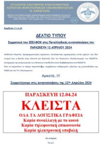 Ο Σ.Ε.ΕΛ.Φ.Ο. Καρδίτσας, μετά από έκτακτη συνεδρίαση του Διοικητικού Συμβουλίου στις 09/04/2024, αποφάσισε τη συμμετοχή του Συλλόγου στις ανά την επικράτεια κινήσεις διαμαρτυρίας της 12/04/2024, ενάντια στις δυσχέρειες που αντιμετωπίζουμε οι λογιστές – φοροτεχνικοί κατά την άσκηση του επαγγέλματός μας και στις εν γένει δυσμενείς επιπτώσεις σε βάρος μας, από τον ελλιπή ή/και πλημμελή σχεδιασμό και υλοποίηση μέτρων της Φορολογικής Διοίκησης.