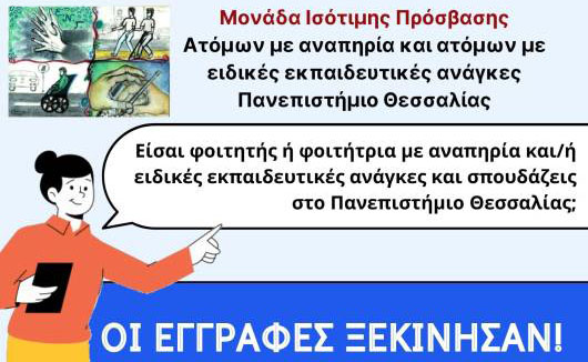 Αν είσαι φοιτητής ή φοιτήτρια με αναπηρία ή/και ειδικές εκπαιδευτικές ανάγκες, σπουδάζεις στο Πανεπιστήμιο Θεσσαλίας και θέλεις να κάνεις την εγγραφή σου στη Μονάδα Ισότιμης Πρόσβασης ακολούθησε τα εξής βήματα: