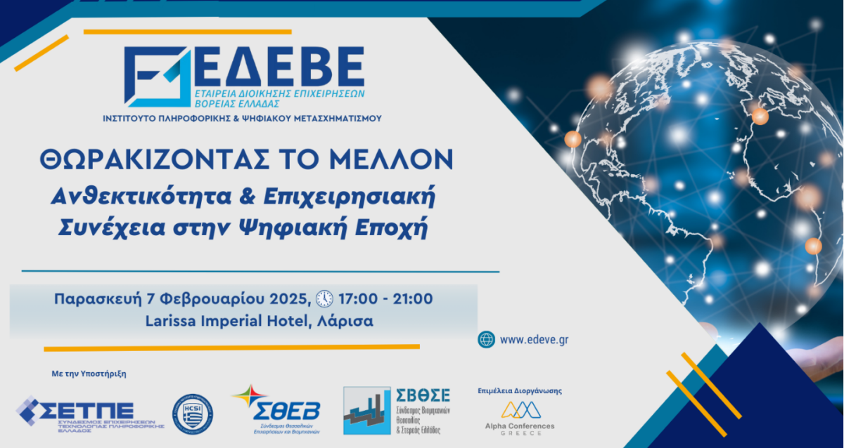 Στο πλαίσιο αυτό η Εταιρεία Διοίκησης Επιχειρήσεων Βόρειας Ελλάδας (ΕΔΕΒΕ) και ειδικότερα το Ινστιτούτο Πληροφορικής και Ψηφιακού Μετασχηματισμού, διοργανώνει στη Λάρισα στις 07 Φεβρουαρίου 2025, στις 17:00 έως 21:00 στο Ξενοδοχείο Larissa Imperial, Εσπερίδα, με θέμα: «Θωρακίζοντας το Μέλλον: Ανθεκτικότητα και Επιχειρησιακή Συνέχεια στην ψηφιακή εποχή».