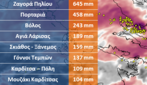Ξεπέρασε τα 600 mm το ύψος βροχής στο Πήλιο την Τρίτη 05/09, ενώ και στην υπόλοιπη Θεσσαλία σημειώθηκαν πολύ μεγάλα ύψη βροχής. Συγκεκριμένα, ο μετεωρολογικός σταθμός της Ζαγοράς από την αρχή (00:00) έως το μεσημέρι (15:00) της Τρίτης 05/09, κατέγραψε 645 mm βροχής.