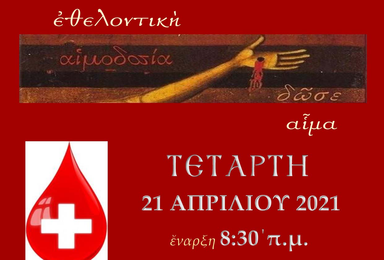 Tο Εκκλησιαστικό Ίδρυμα Αιμοδοσίας της Ιεράς μας Μητροπόλεως «Ο Άγιος Νεομάρτυς Κωνσταντίνος ο εν Καππούα (Καππά) Καρδίτσης μαρτυρήσας» θα πραγματοποιήσει Εθελοντική Αιμοληψία την Τρίτη 5 Απριλίου 2022 από ώρα 8:30΄π.μ. στο Πνευματικό Κέντρο του Ιερού Μητροπολιτικού Ναού Αγίων Κωνσταντίνου και Ελένης Καρδίτσης. Οι αιμοδότες των προηγουμένων Αιμοληψιών μπορούν να προσέλθουν ώστε να πραγματοποιήσουν εθελοντική αιμοδοσία …