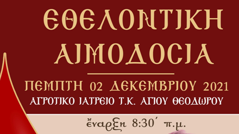 Εθελοντική από την Ιερά Μητρόπολη Θεσσαλιώτιδος και Φαναριοφερσάλων θα πραγματοποιηθεί στο Αγροτικό Ιατρείο Τ.Κ. Αγίου Θεοδώρου την Πέμπτη 2 Δεκεμβρίου, με ώρα έναρξης 8:30π.μ. Η αιμοδοσία αφορά την ΙΑ ΄ Αρχιερατική Περιφέρεια (Παλαμά) και τις Τοπικές Κοινότητες Αγίου Θεοδώρου, Μακρυχωρίου, Μυρίνης, Προδρόμου, Σταυρού, Αγίας Παρασκευής, Καρποχωρίου, Ματαράγκας.