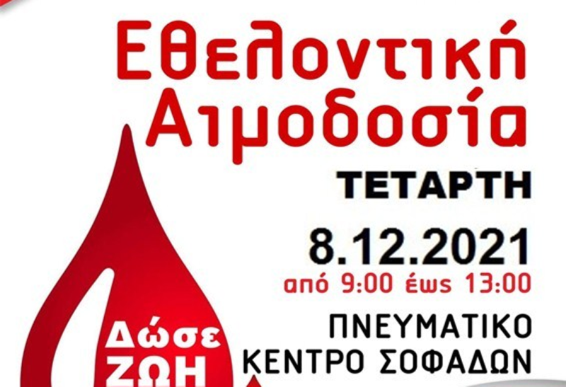 Εθελοντική αιμοδοσία την Τετάρτη 8/12 στο Δήμο Σοφάδων
