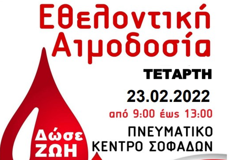 Εθελοντική αιμοδοσία την Τετάρτη 23 Φεβρουαρίου στο Δήμο Σοφάδων