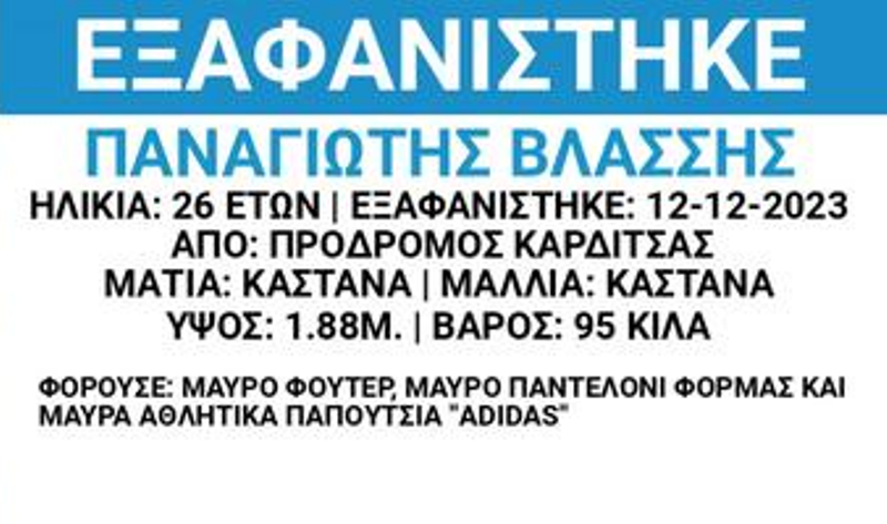 Συναγερμός για την εξαφάνιση 26χρονου από την Καρδίτσα