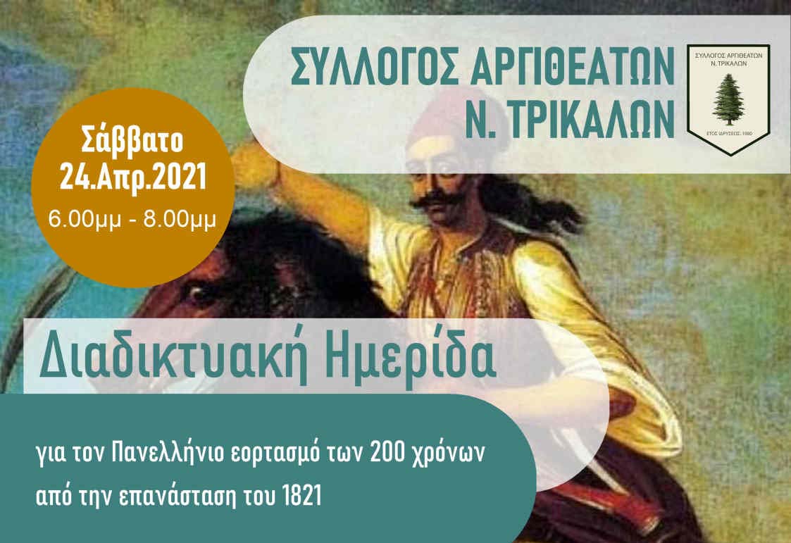 Ο Σύλλογος Αργιθεατών Τρικάλων διοργανώνει Διαδικτυακή Ημερίδα για τον Πανελλήνιο εορτασμό των 200 χρόνων από την επανάσταση του 1821. Η Ημερίδα θα πραγματοποιηθεί διαδικτυακά το Σάββατο 24 Απριλίου 2021, ώρα 6.00 – 8.00 μ.μ., θα είναι ανοιχτή για το ευρύ κοινό και για τους απανταχού Αργιθεάτες και θα περιλαμβάνει τις ακόλουθες εισηγήσεις: Εισήγηση κ. Κουτή …