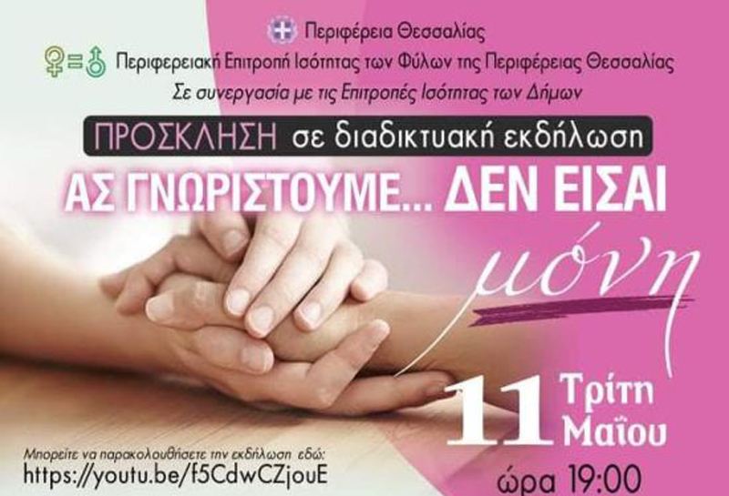 Την Τρίτη 11 Μαΐου και ώρα 7 μ.μ. η Περιφερειακή Επιτροπή Ισότητας των Φύλων της Περιφέρειας Θεσσαλίας, διοργανώνει ανοιχτή διαδικτυακή εκδήλωση υπό την αιγίδα της Περιφέρειας Θεσσαλία, σε συνεργασία με τις Επιτροπές Ισότητας των Δήμων, με θέμα “Ας γνωριστούμε….Δεν είσαι μόνη” Στόχος της εκδήλωσης είναι να γνωρίσει το ευρύ κοινό την δουλειά των Συμβουλευτικών Κέντρων …