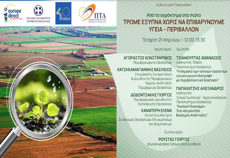 Η Περιφέρεια Θεσσαλίας και το Κέντρο Ευρωπαϊκής Πληροφόρησης Περιφέρειας Θεσσαλίας Europe Direct σας προσκαλούν να παρακολουθήσετε τη διαδικτυακή παρουσίαση με θέμα «Από το αγρόκτημα στο πιάτο – Τρώμε έξυπνα χωρίς να επιβαρύνουμε υγεία – περιβάλλον» που θα πραγματοποιηθεί την Τετάρτη 21 Απριλίου 2021 και ώρα 12.00-13.30. Θα παρουσιαστούν τα βασικά χαρακτηριστικά της στρατηγικής της ΕΕ …