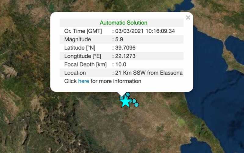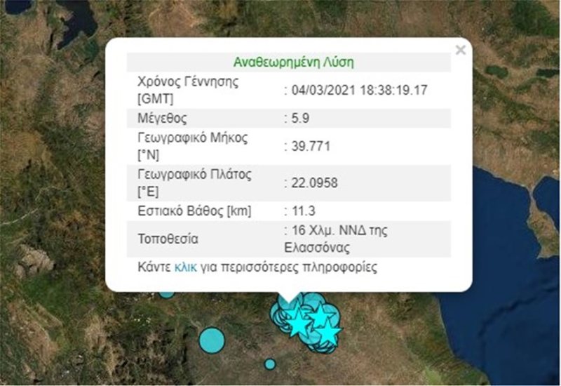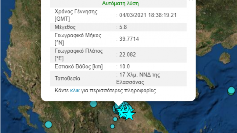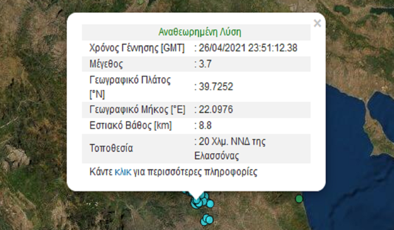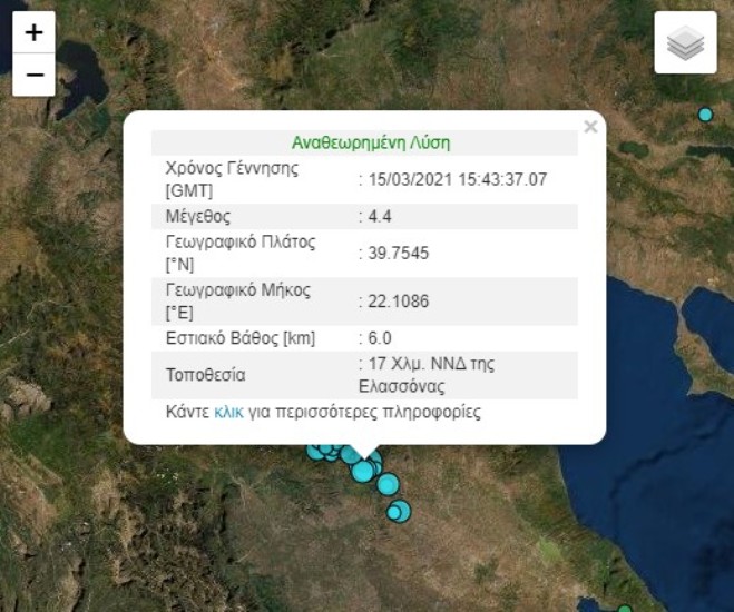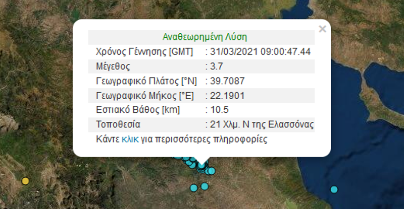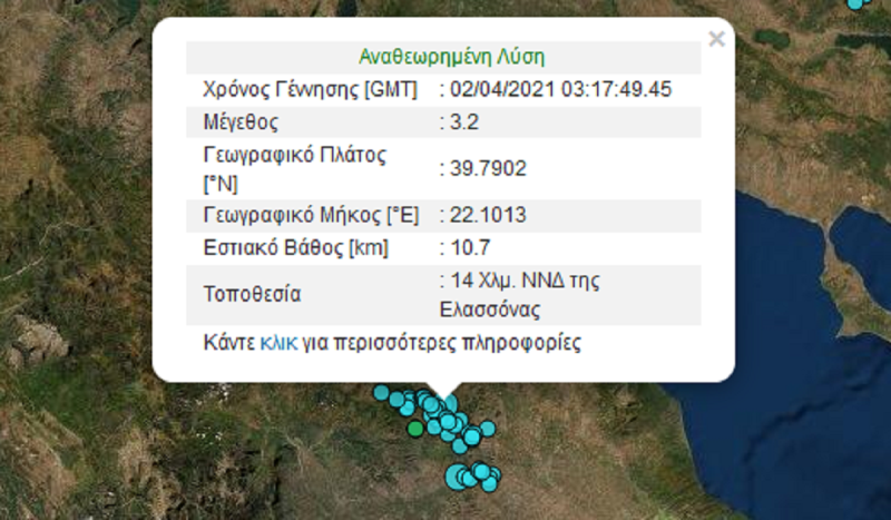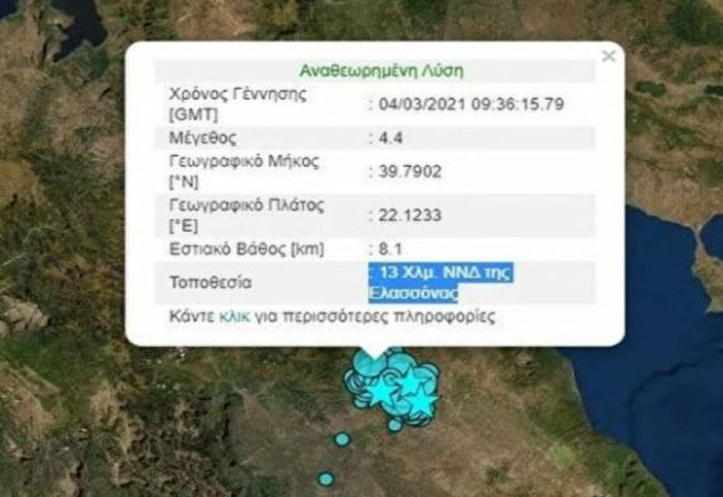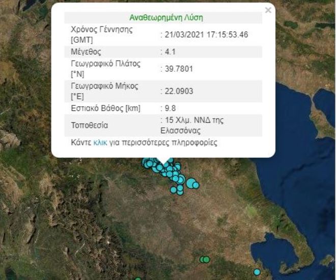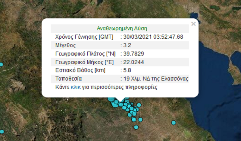 Δυο νέοι μετασεισμοί 3,4 Ρίχτερ κούνησαν την Ελασσόνα νωρίς το πρωί της Δευτέρας 29 Μαρτίου. Σύμφωνα με τα στοιχεία από το Γεωδυναμικό Ινστιτούτο του Εθνικού Αστεροσκοπείου Αθηνών καταγράφηκαν δύο νέες σεισμικές δονήσεις 3,4 Ρίχτερ. Είχαν και οι δύο την ίδια ένταση και σημειώθηκαν σχεδόν την ίδια στιγμή, με διαφορά δευτερολέπτων.