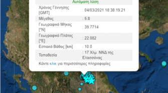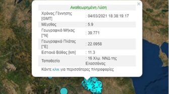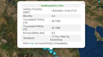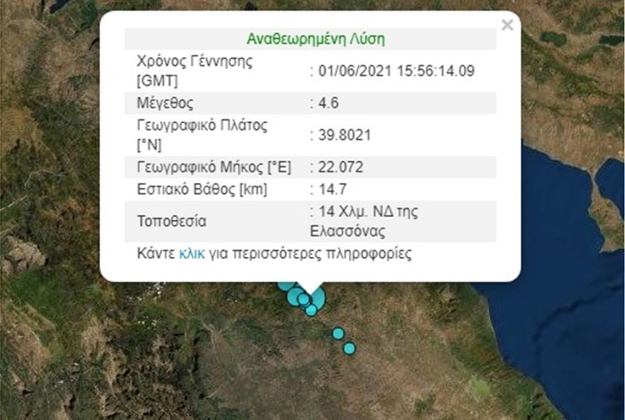 Σεισμός 4,6 Ρίχτερ «ταρακούνησε» λίγο πριν τις 7 το απόγευμα της Τρίτης 1η Ιουνίου την Ελασσόνα, η οποία ακόμα μετράει τις πληγές της από το «διπλό» χτύπημα του Εγκέλαδου τον περασμένο Μάρτιο. Το επίκεντρο του σεισμού εντοπίζεται 14 χιλιόμετρα νοτιοδυτικά της Ελασσόνας και το εστιακό του βάθος είναι μόλις 14,7 χιλιόμετρα. Να σημειωθεί ότι αρχικά το Γεωδυναμικό …
