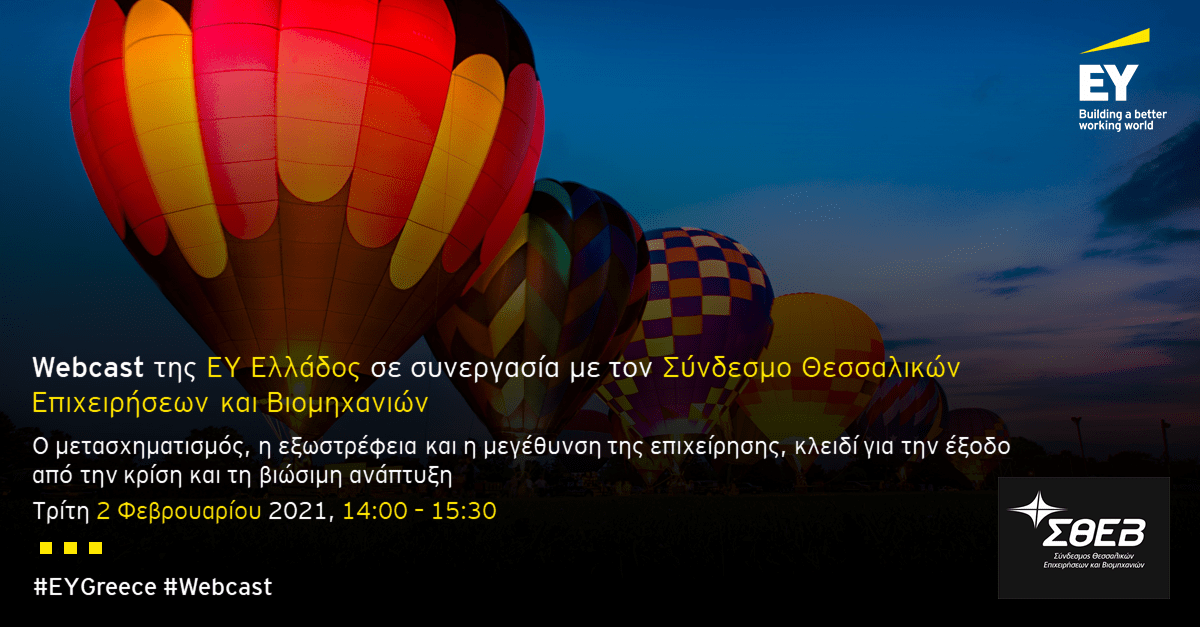 Πιστοί στη δέσμευσή τους για την υποστήριξη των ελληνικών επιχειρήσεων κατά τη διάρκεια της πανδημίας, καθώς και την προετοιμασία τους για την επόμενη ημέρα, ο Σύνδεσμος Θεσσαλικών Επιχειρήσεων και Βιομηχανιών (ΣΘΕΒ) και η EY Ελλάδος, διοργανώνουν webcast την Τρίτη 2 Φεβρουαρίου 2021, 14:00-15:30, με θέμα: «Ο μετασχηματισμός, η εξωστρέφεια και η μεγέθυνση της επιχείρησης, κλειδί …