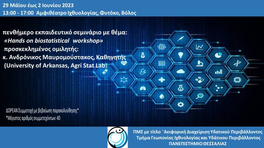 Το Πρόγραμμα Μεταπτυχιακών Σπουδών του Τμήματος Γεωπονίας Ιχθυολογίας και Υδάτινου Περιβάλλοντος με τίτλο ¨Αειφορική Διαχείριση Υδατικού Περιβάλλοντος¨ διοργανώνει πενθήμερο εκπαιδευτικό σεμινάριο με θέμα: «Hands on biostatistical workshop» με προσκεκλημένο ομιλητή τον Καθηγητή, κ. Ανδρόνικο Μαυρομούστακο (University of Arkansas, Agri Stat Lab). Το σεμινάριο θα διεξαχθεί από τη Δευτέρα 29 Μαϊου έως και την Παρασκευή 2 …