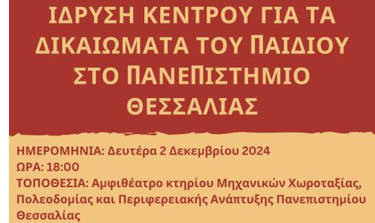 Κέντρο για τα Δικαιώματα του Παιδιού θα δημιουργηθεί στο Πανεπιστήμιο Θεσσαλίας