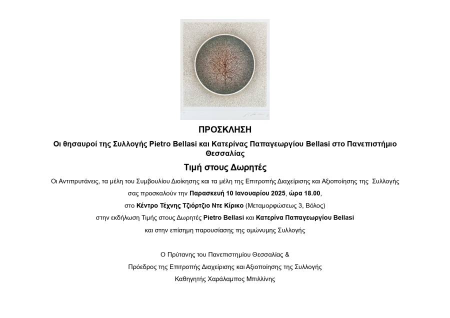 Την Παρασκευή 10 Ιανουαρίου 2025 και ώρα 6:00 μ.μ., στο Κέντρο Τέχνης Τζιόρτζιο ντε Κίρικο (Μεταμορφώσεως 3, Βόλος), ο Πρύτανης Χαράλαμπος Μπιλλίνης, οι Αντιπρυτάνεις, τα μέλη του Συμβουλίου Διοίκησης του Πανεπιστημίου Θεσσαλίας και τα μέλη της Επιτροπής Διαχείρισης και Αξιοποίησης της Συλλογής πραγματοποιούν ειδική εκδήλωση προς τιμήν των Δωρητών Pietro Bellasi και Κατερίνας Παπαγεωργίου Bellasi. …