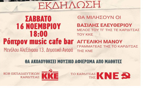 Η Κομματική Οργάνωση Εκπαιδευτικών και το Τομεακό Συμβούλιο της ΚΝΕ με αφορμή την επέτειο της εξέγερσης του Πολυτεχνείου το Νοέμβρη του 1973, οργανώνουν εκδήλωση το Σάββατο 16 Νοέμβρη στις 6 μμ στο καφέ «ΡΟΠΤΡΟΝ» (μεγάλου Αλεξάνδρου 13 δημοτική αγορά) Θα μιλήσουν ο Βασίλης Ελευθερίου μέλος του ΤΓ της ΤΕ Καρδίτσας του ΚΚΕ και η Αγγελική …