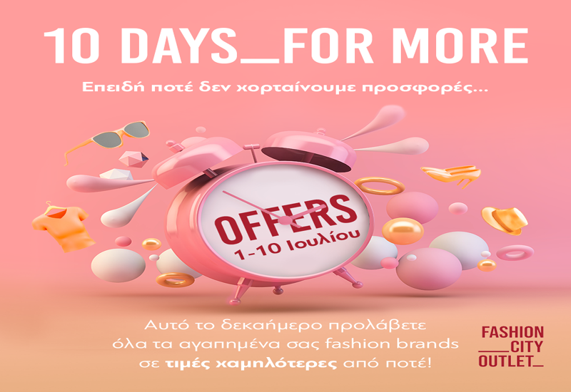 Πριν ακόμη μπούμε στην περίοδο των καλοκαιρινών εκπτώσεων ένα σούπερ δεκαήμερο προσφορών στο Fashion City Outlet μας καλεί να μπούμε σε καταναλωτικό πειρασμό! Από σήμερα Πέμπτη 1 Ιουλίου έως και το Σάββατο 10 Ιουλίουστο Fashion City Outlet, βρίσκεις ρούχα, υποδήματα και αξεσουάρ από τα αγαπημένα σου brands, σε τιμές …που παίρνουν δέκα με τόνο! Ακόμα …