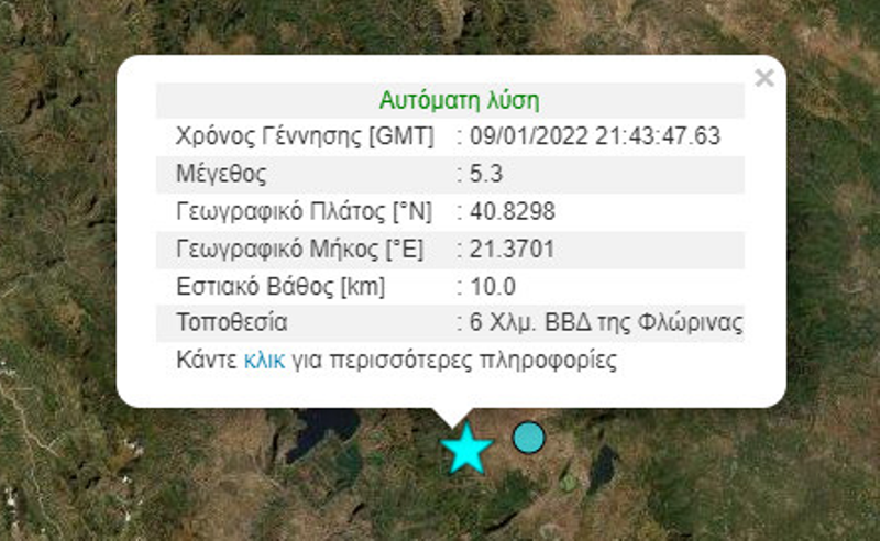 Ισχυρός σεισμός 5,3 Ρίχτερ σημειώθηκε λίγο πριν τα μεσάνυχτα της Κυριακής στη Φλώρινα. Ο σεισμός έγινε 6 χιλιόμετρα βόρεια βορειοδυτικά της Φλώρινας και σε εστιακό βάθος 10 χιλιομέτρων. Ο σεισμός, σύμφωνα με τις πρώτες αναφορές, ήταν ιδιαίτερα αισθητός στη Βόρεια Ελλάδα. Σύμφωνα με αναφορές, ο σεισμός είχε μεγάλη χρονική διάρκεια και βουητό, ενώ έγινε αντιληπτός σε …