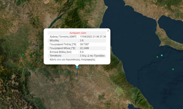 Ασθενής σεισμική δόνηση 3,6 βαθμών της κλίμακας Ρίχτερ σημειώθηκε λίγα λεπτά μετά τα μεσάνυχτα την Τρίτη με το επίκεντρό του να εντοπίζεται κοντά στον Τύρναβο. Σύμφωνα με την ανακοίνωση του Γεωδυναμικού Ινστιτούτου του Εθνικού Αστεροσκοπείου Αθηνών, ο σεισμός καταγράφηκε την 00:06 και το επίκεντρό του εντοπίστηκε σε απόσταση 3 χιλιομέτρων δυτικά του Τυρνάβου. Το εστιακό βάθος του υπολογίστηκε στα 5 χιλιόμετρα. …