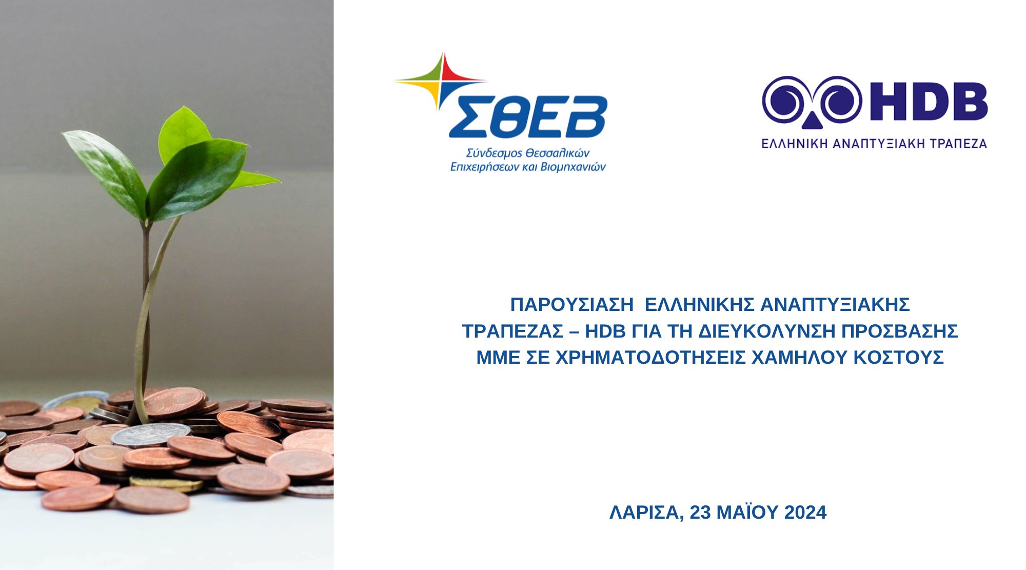 Την Πέμπτη 23 Μαΐου και ώρα 19:00 στις εγκαταστάσεις του ΣΘΕΒ στη Λάρισα θα πραγματοποιηθεί συνάντηση γνωριμίας των μελών του Συνδέσμου με την Ελληνική Αναπτυξιακή Τράπεζα, στην οποία θα συμμετέχει ο Πρόεδρός της κ. Γιώργο Ζαββός και η Διευθύνουσα Σύμβουλος κα Ισμήνη Παπακυρίλλου. Σκοπός της συνάντησης είναι η ενημέρωση των θεσσαλικών επιχειρήσεων για τον ρόλο της Ελληνικής Αναπτυξιακής Τράπεζας …