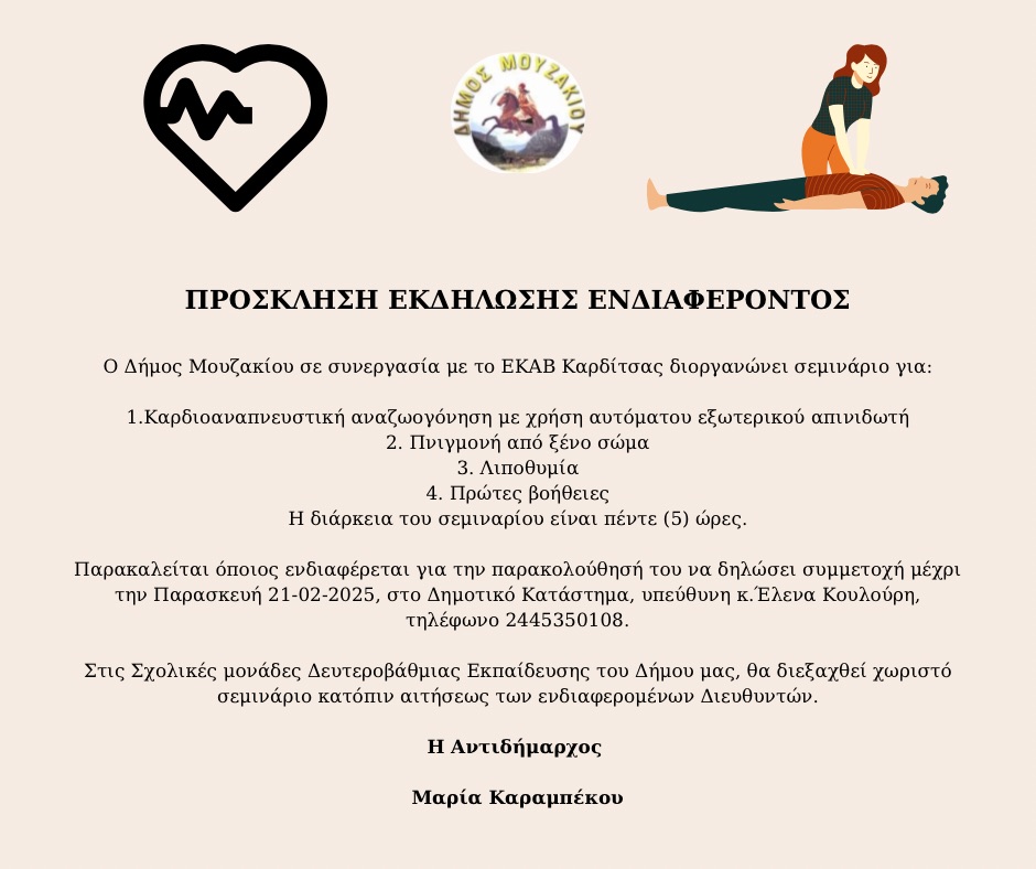 Ο Δήμος Μουζακίου σε συνεργασία με το ΕΚΑΒ Καρδίτσας διοργανώνει σεμινάριο για: Καρδιοαναπνευστική αναζωογόνηση με χρήση αυτόματου εξωτερικού απινιδωτή Πνιγμονή από ξένο σώμα Λιποθυμία Πρώτες βοήθειες Η διάρκεια του σεμιναρίου είναι πέντε (5) ώρες. Παρακαλείται όποιος ενδιαφέρεται για την παρακολούθησή του να δηλώσει συμμετοχή μέχρι την Παρασκευή 21-02-2025, στο Δημοτικό Κατάστημα, υπεύθυνη κ. Έλενα Κουλούρη, …