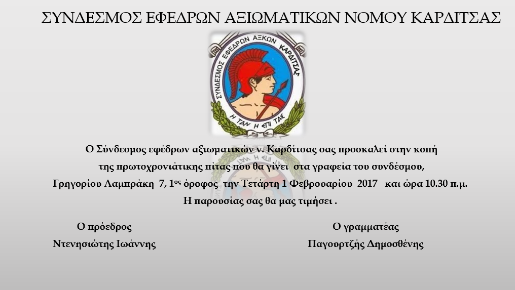 Ο Σύνδεσμος Εφέδρων Αξιωματικών ν. Καρδίττσας, σας προσκαλεί στη κοπή της πρωτοχρονιάτικης πίτας που θα γίνει στα γραφεία του συνδέσμου, Γρηγορίου Λαμπράκη 7, 1ος όροφος, την Τετάρτη 1η Φεβρουαρίου 2017 και ώρα 10.30 π.μ. Η παρουσία σας θα μας τιμήσει