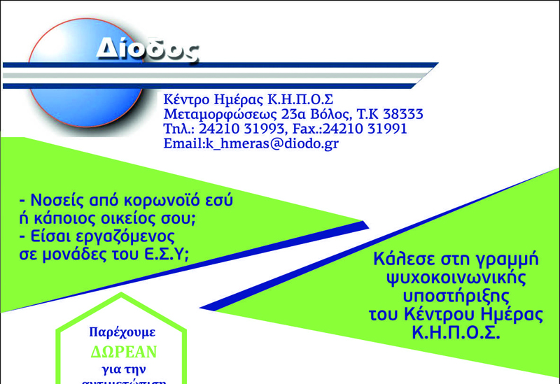 Υπό την αιγίδα του Υπουργείου Υγείας και της Αστικής μη Κερδοσκοπικής εταιρείας «Δίοδος», ανακοινώνεται η λειτουργία της γραμμής ψυχοκοινωνικής υποστήριξης του Κέντρου Ημέρας Κ.Η.Π.Ο.Σ. Απευθύνεται: στους εργαζόμενους σε μονάδες του Ε.Σ.Υ. στη Θεσσαλία (Πανεπιστημιακό Γενικό Νοσοκομείο Λάρισας, Γενικό Νοσοκομείο Λάρισας «Κουτλιμπάνειο», Γενικό Νοσοκομείο Βόλου «Αχιλλοπούλειο», Γενικό Νοσοκομείο Καρδίτσας, Γενικό Νοσοκομείο Τρικάλων και στα κέντρα υγείας …