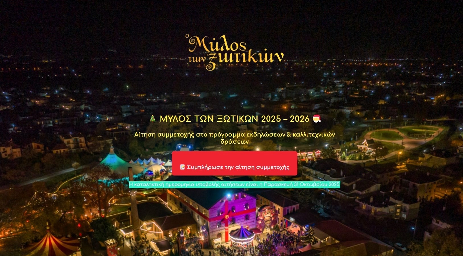 Και για τις καλλιτεχνικές εκδηλώσεις και δράσεις ο Μύλος των Ξωτικών απευθύνεται στους φορείς, τους συλλόγους, τα σωματεία, τους πολίτες. Ο 14ος Μύλος των Ξωτικών ξεκινά στις 21 Νοεμβρίου 2025 και θα φιλοξενήσει δραστηριότητες που παρουσιάζονται στην κεντρική σκηνή του Μύλου. Η ένταξη στο πρόγραμμα εκδηλώσεων, οι χορωδίες, τα χορευτικά, οι ιδέες για νέα δράση, …