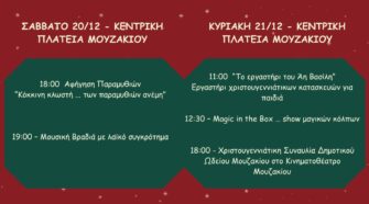 Ο Δήμος Μουζακίου προσκαλεί μικρούς και μεγάλους το Σαββατοκύριακο 20-21 Δεκεμβρίου, σε μια διήμερη γιορτή γεμάτη μουσική, δημιουργία, παραμύθια και μαγεία. Σάββατο 20/12 – Κεντρική Πλατεία Μουζακίου 18:00 – Αφήγηση παραμυθιών «Κόκκινη κλωστή… των παραμυθιών ανέμη» 19:00 – Μουσική βραδιά με λαϊκό συγκρότημα Κυριακή 21/12 – Κεντρική Πλατεία Μουζακίου 11:00 – «Το εργαστήρι του Άη …