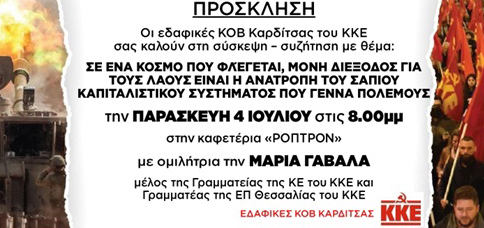 Οι εδαφικές κομματικές οργανώσεις (ΚΟΒ) του ΚΚΕ στην πόλη της Καρδίτσας οργανώνουν σύσκεψη συζήτηση με θέμα: «ΣΕ ΕΝΑ ΚΟΣΜΟ ΠΟΥ ΦΛΕΓΕΤΑΙ, ΜΟΝΗ ΔΙΕΞΟΔΟΣ ΓΙΑ ΤΟΥΣ ΛΑΟΥΣ ΕΙΝΑΙ Η ΑΝΑΤΡΟΠΗ ΤΟΥ ΣΑΠΙΟΥ ΚΑΠΙΤΑΛΙΣΤΙΚΟΥ ΣΥΣΤΗΜΑΤΟΣ ΠΟΥ ΓΕΝΝΑ ΠΟΛΕΜΟΥΣ» Η σύσκεψη θα πραγματοποιηθεί την Παρασκευή 4 Ιουλίου στις 8 μμ στο καφέ «ΡΟΠΤΡΟΝ». Ομιλήτρια θα είναι η Μαρία Γαβαλά …