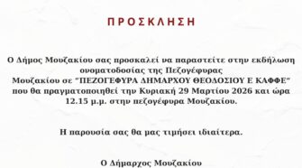 Ο Δήμος Μουζακίου σας προσκαλεί να παραστείτε στην εκδήλωση ονοματοδοσίας της πεζογέφυρας Μουζακίου σε “ΠΕΖΟΓΕΦΥΡΑ ΔΗΜΑΡΧΟΥ ΘΕΟΔΟΣΙΟΥ Ε. ΚΑΦΦΕ” που θα πραγματοποιηθεί την Κυριακή 29 Μαρτίου 2026 και ώρα 12.15 μ.μ. στην πεζογέφυρα Μουζακίου. Πρόγραμμα Εκδήλωσης (ΩΡΑ ΕΝΑΡΞΗΣ 12:15 μ.μ.) Προσέλευση – Επιμνημόσυνη δέηση Ανάγνωση απόφασης Ονοματοδοσίας της πεζογέφυρας Μουζακίου σε «ΠΕΖΟΓΕΦΥΡΑ ΔΗΜΑΡΧΟΥ …