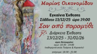 «Σαν…από παραμύθι» είναι ο τίτλος της Έκθεσης Ζωγραφικής της ταλαντούχας Μαρίας Οικονομίδου η οποία εγκαινιάστηκε το Σάββατο 13 Δεκεμβρίου και συνεχίζεται με μεγάλη επιτυχία, στον καλαίσθητο χώρο της επί της οδού Κολοκοτρώνη 14. Πλήθος κόσμου και φιλότεχνων είναι συνεχώς εκεί για να θαυμάσουν τα έργα της ταλαντούχας καλλιτέχνιδας και να μιλήσουν μαζί της. Η Μαρία …