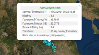 Νέος μετασεισμός σημειώθηκε το πρωί της Τετάρτης, και συγκεκριμένα στις 10:22, στην Ελασσόνα που δοκιμάζεται εδώ και ένα δεκαπενθήμερο περίπου. Σύμφωνα με το Γεωδυναμικό Ινστιτούτο του Εθνικού Αστεροσκοπείου, ο μετασεισμός είχε εστιακό βάθος 5,4 χλμ. και το επίκεντρο εντοπίζεται 16 Χλμ. ΝΔ της Ελασσόνας.