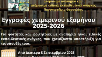 Η Μονάδα Ισότιμης Πρόσβασης του Πανεπιστημίου Θεσσαλίας ξεκινά τις εγγραφές για το χειμερινό εξάμηνο 2025-2026! Από Δευτέρα 8 Σεπτεμβρίου 2025 έως και Παρασκευή 31 Οκτωβρίου 2025. Εάν είσαι φοιτητής/φοιτήτρια με αναπηρία ή/και ειδικές εκπαιδευτικές ανάγκες στο Πανεπιστήμιο Θεσσαλίας, μπορείς να κάνεις την εγγραφή σου στη Μονάδα Ισότιμης Πρόσβασης και να έχεις την υποστήριξη που χρειάζεσαι για τις …