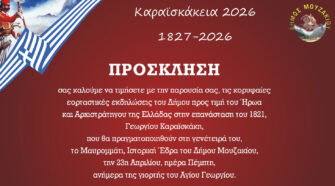Ο Δήμος Μουζακίου σας προσκαλεί στις κορυφαίες εορταστικές εκδηλώσεις προς τιμή του Ήρωα και Αρχιστράτηγου της Ελλάδας στην επανάσταση του 1821, Γεώργιου Καραϊσκάκη, που θα πραγματοποιηθούν στη γενέτειρά του, το Μαυρομμάτι, Ιστορική έδρα του Δήμου Μουζακίου, την 23η Απριλίου 2026, ημέρα Πέμπτη, ανήμερα της γιορτής του Αγίου Γεωργίου. Με τιμή, Ο Δήμαρχος Μουζακίου Θεοφάνης …