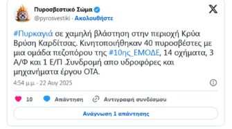 Συναγερμός έχει σημάνει στην Καρδίτσα για πυρκαγιά που ξέσπασε νωρίς το απόγευμα της Παρασκευής 22 Αυγούστου. Η φωτιά εκδηλώθηκε σε χαμηλή βλάστηση στην περιοχή Κρύα Βρύση Καρδίτσας. Άμεσα έφτασαν στο σημείο 40 πυροσβέστες με μία ομάδα πεζοπόρου της 10ης ΕΜΟΔΕ, 10 οχήματα και συνδράμουν υδροφόρες και μηχανήματα έργου ΟΤΑ, ενώ από αέρος επιχειρούν 3 αεροσκάφη και ένα ελικόπτερο. «Πυρκαγιά …