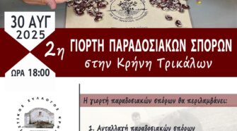 Η Κρήνη Τρικάλων φιλοξενεί για δεύτερη χρονιά τη Γιορτή Ανταλλαγής ΠαραδοσιακώνΣπόρων, μια εκδήλωση αφιερωμένη στη διατήρηση και διάδοση των τοπικών ποικιλιών, με τη συνεργασία του Πολιτιστικού Συλλόγου Κρήνης και του «Πελίτι» Το Σάββατο 30 Αυγούστου 2025, στις 18:00 το απόγευμα, η κεντρική πλατεία της Κρήνης Τρικάλων θα γεμίσει χρώματα, αρώματα και ανθρώπους με κοινό πάθος …