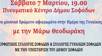 Μια ξεχωριστή εκδήλωση με αφορμή τον εορτασμό για την παγκόσμια ημέρα της γυναίκας οργανώνουν ο Μορφωτικός Σύλλογος Σοφάδων και ο Σύλλογος Γυναικών Σοφάδων το Σάββατο 7 Μαρτίου στις 7μ.μ στο Πνευματικό Κέντρο Σοφάδων με τίτλο: « Ημερολόγια Γυναικών». Η Μάρω Θεοδωράκη μέσα από τις μελωδίες της στο πιάνο μιλάει για τη σύγχρονη γυναίκα, τις αναζητήσεις …