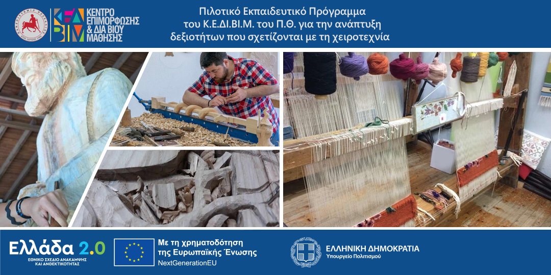 Το Κ.Ε.ΔΙ.ΒΙ.Μ του Πανεπιστημίου Θεσσαλίας σε συνεργασία με το Υπουργείο Πολιτισμού υλοποιούν το επιδοτούμενο πρόγραμμα με τίτλο: «Πιλοτικό Εκπαιδευτικό Πρόγραμμα του Κ.Ε.ΔΙ.ΒΙ.Μ. του Πανεπιστημίου Θεσσαλίας για την ανάπτυξη δεξιοτήτων που σχετίζονται με τη χειροτεχνία» και συγκεκριμένα των κλάδων: υφαντικής και ξυλοτεχνίας, το οποίο εντάσσεται στο πλαίσιο της ευρύτερης Δράσης με τίτλο: «Αναζωογόνηση των τοπικών χειροτεχνικών μονάδων ως κινητήρια δύναμη της ανάπτυξης» …
