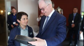 Ο καταγόμενος από την Καρδίτσα μαθητής της ΣΤ τάξης του 4ου Δημοτικού Σχολείου Μεσολογγίου Κερασιώτης Σεραφείμ, προσφέρει έργο του στον Πρόεδρο Δημοκρατίας κο. Κωνσταντίνο Τασούλα